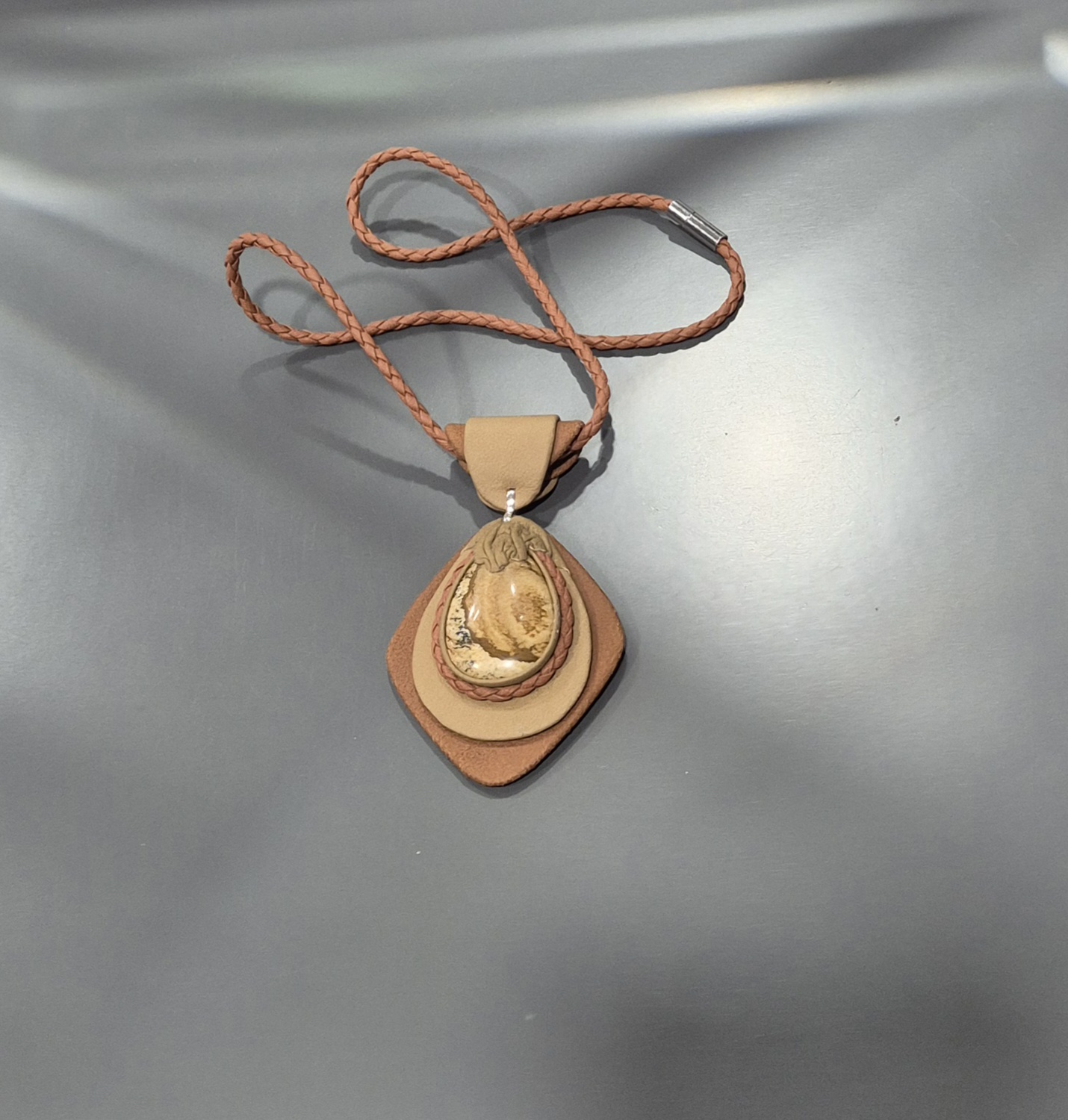 Išraiškingas odos kaklo papuošalas, papuoštas  odos ir agato deriniu. Ilgis apie 55 cm. Agatas – sėkmės, laimės, meilės ir materialinės gerovės teikėjas ir dvasinių žaizdų gydytojas.  Agatas tinka visiems, nepriklausomai nuo Zodiako ženklo, lyties ir amžiaus. Stiprus apsaugos akmuo, nuo senovės naudojamas kaip talismanas ir amuletas. Apsaugo nuo neigiamų energijų, bei neigiamų išorės reiškinių ir pavojų. Globoja esančius toli nuo namų, sukuria stiprią apsaugą.