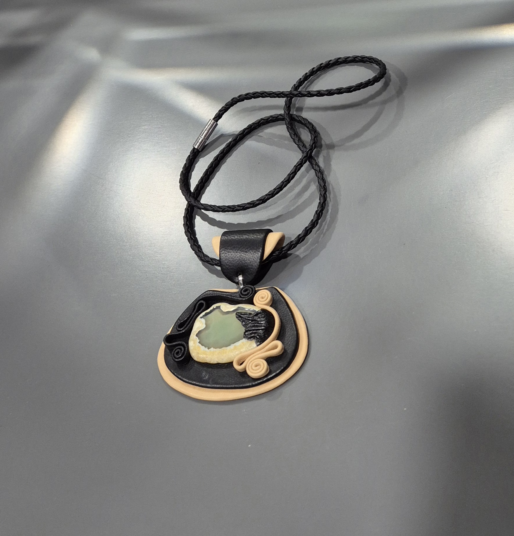 Išraiškingas, puošnus kaklo papuošalas, papuoštas  agato akmeniu. Virvelės ilgis ÷ 58 cm. Agatas – sėkmės, laimės, meilės ir materialinės gerovės teikėjas ir dvasinių žaizdų gydytojas.  Agatas tinka visiems, nepriklausomai nuo Zodiako ženklo, lyties ir amžiaus. Tai stiprus apsaugos akmuo, nuo senovės naudojamas kaip talismanas ir amuletas. Apsaugo nuo neigiamų energijų, bei neigiamų išorės reiškinių ir pavojų. Globoja esančius toli nuo namų, sukuria stiprią apsaugą.